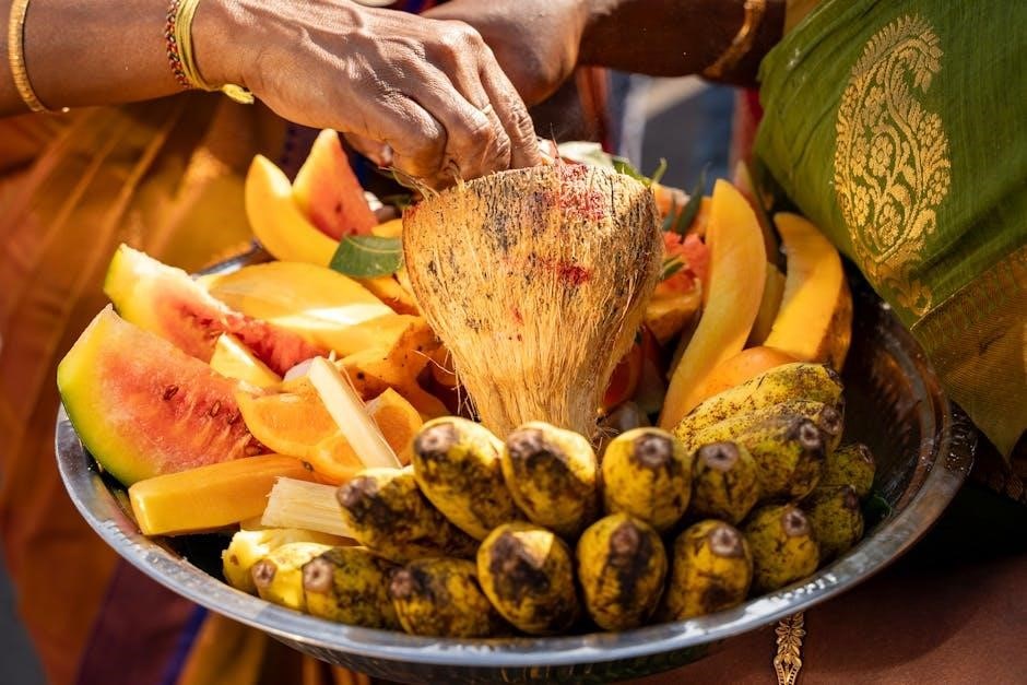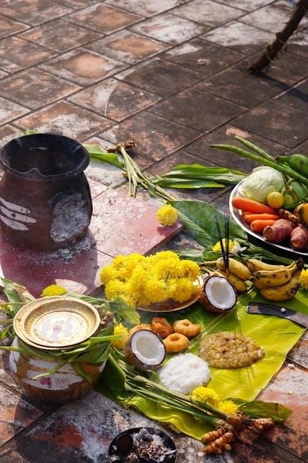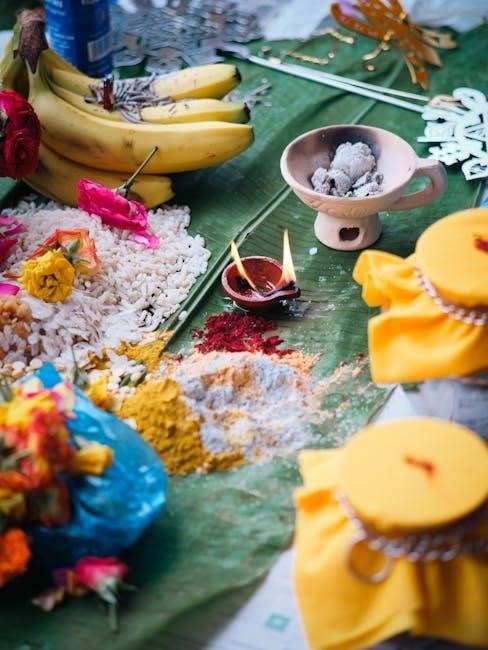 Essential samagri typically includes raw rice (akshintalu), bananas, coconuts, betel leaves, areca nuts, turmeric powder, kumkum, sandalwood paste, incense sticks, camphor, and a ghee lamp․ Flowers, particularly marigolds, are also commonly used․